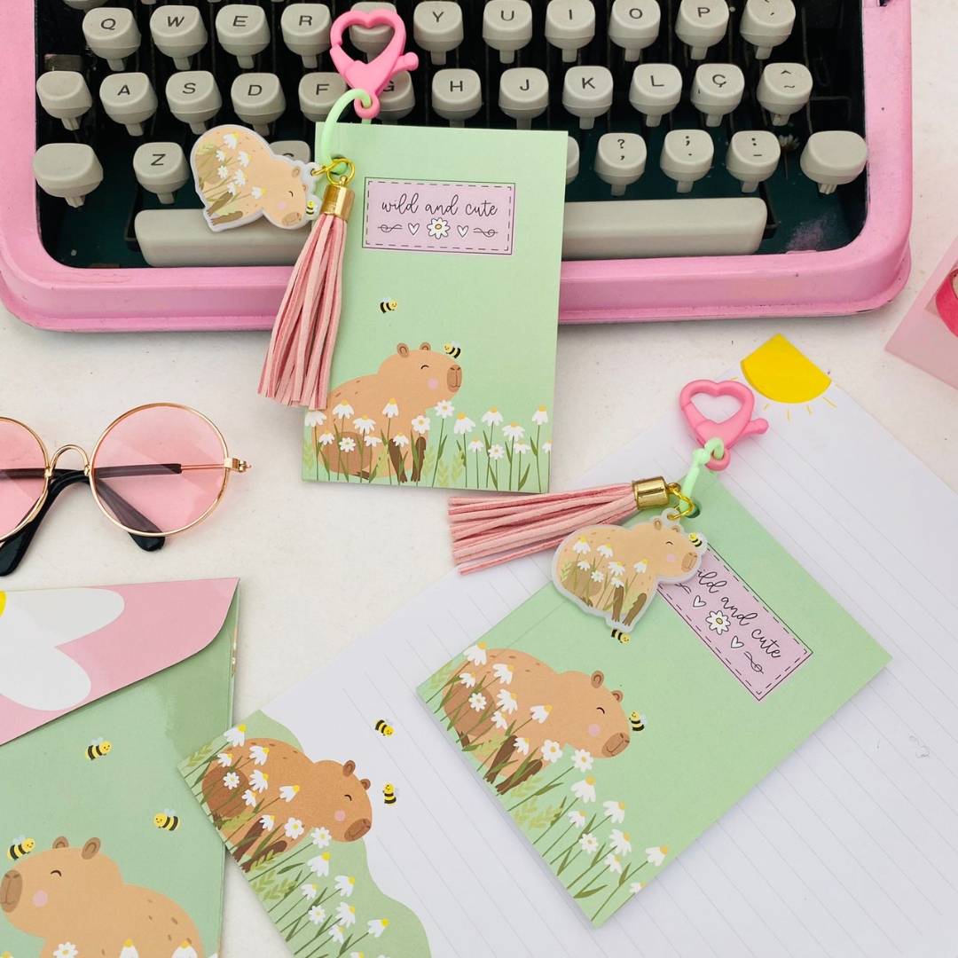 O mini caderno chaveirinho acompanha pingente de capivara e folhas lisas de 90g/m!
