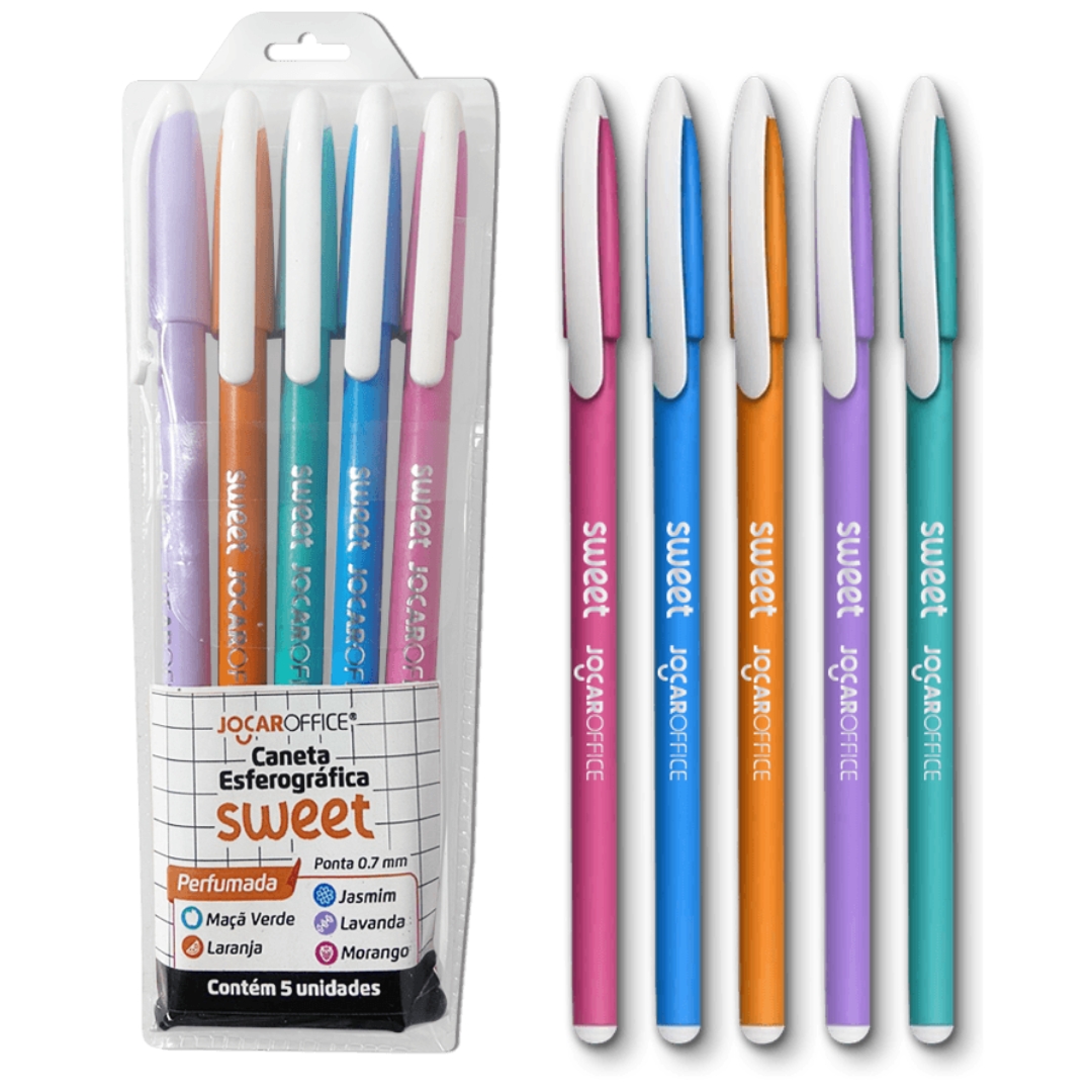 Escrever tem um sabor especial, e agora também um aroma, com a Caneta Esferográfica Perfumada Sweet Ponta 0.7 - Estojo com 5 Unidades Jocar Office.
