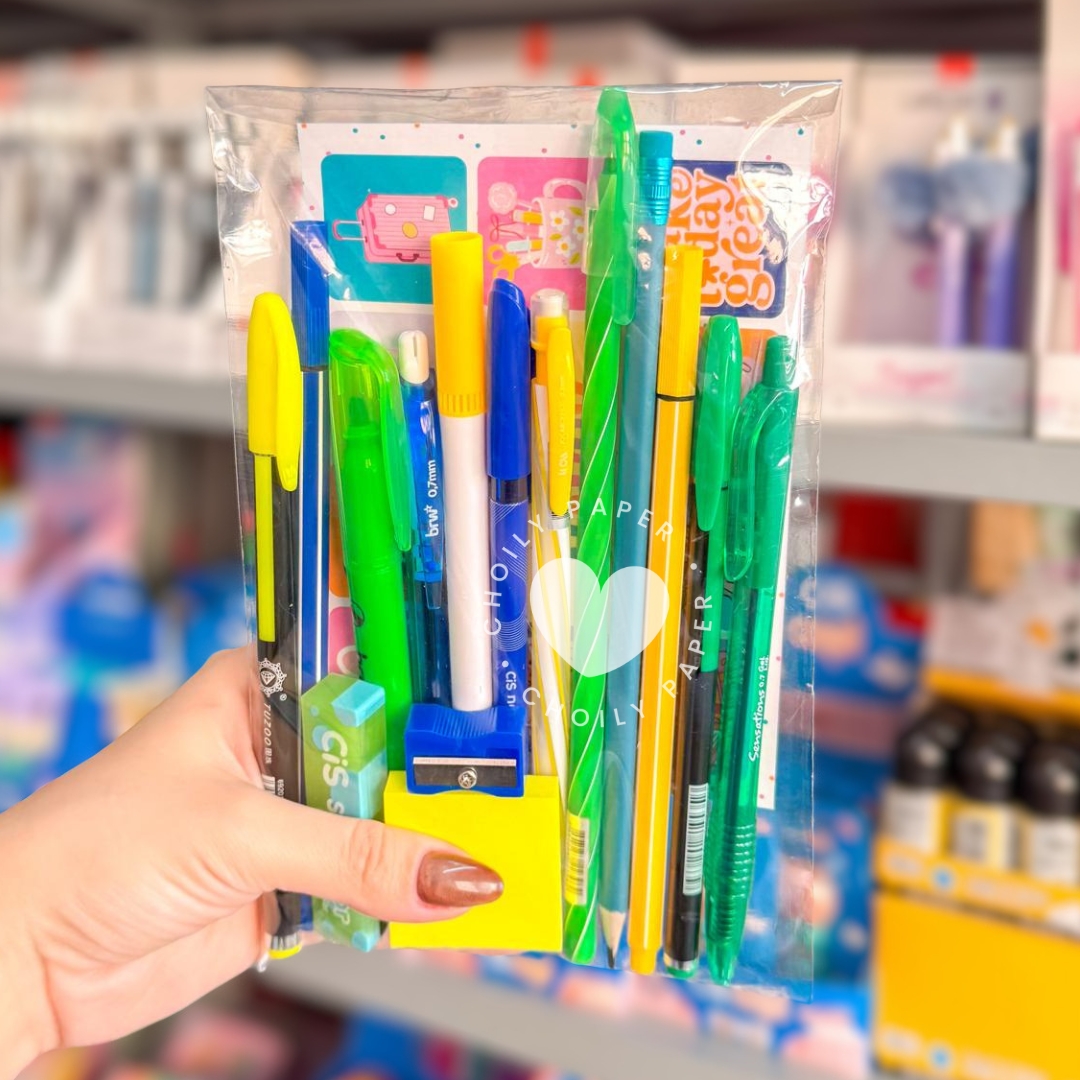Se você ama papelaria, prepare-se para se apaixonar! Nosso kit vem com 15 itens variados nas cores do Brasil! Todos os itens são escolhidos com carinho para deixar seu dia mais criativo, organizado e cheio de estilo. Nosso kit é ideal para que você possa conhecer novos itens, todos úteis para o seu dia dia escolar ou no trabalho.