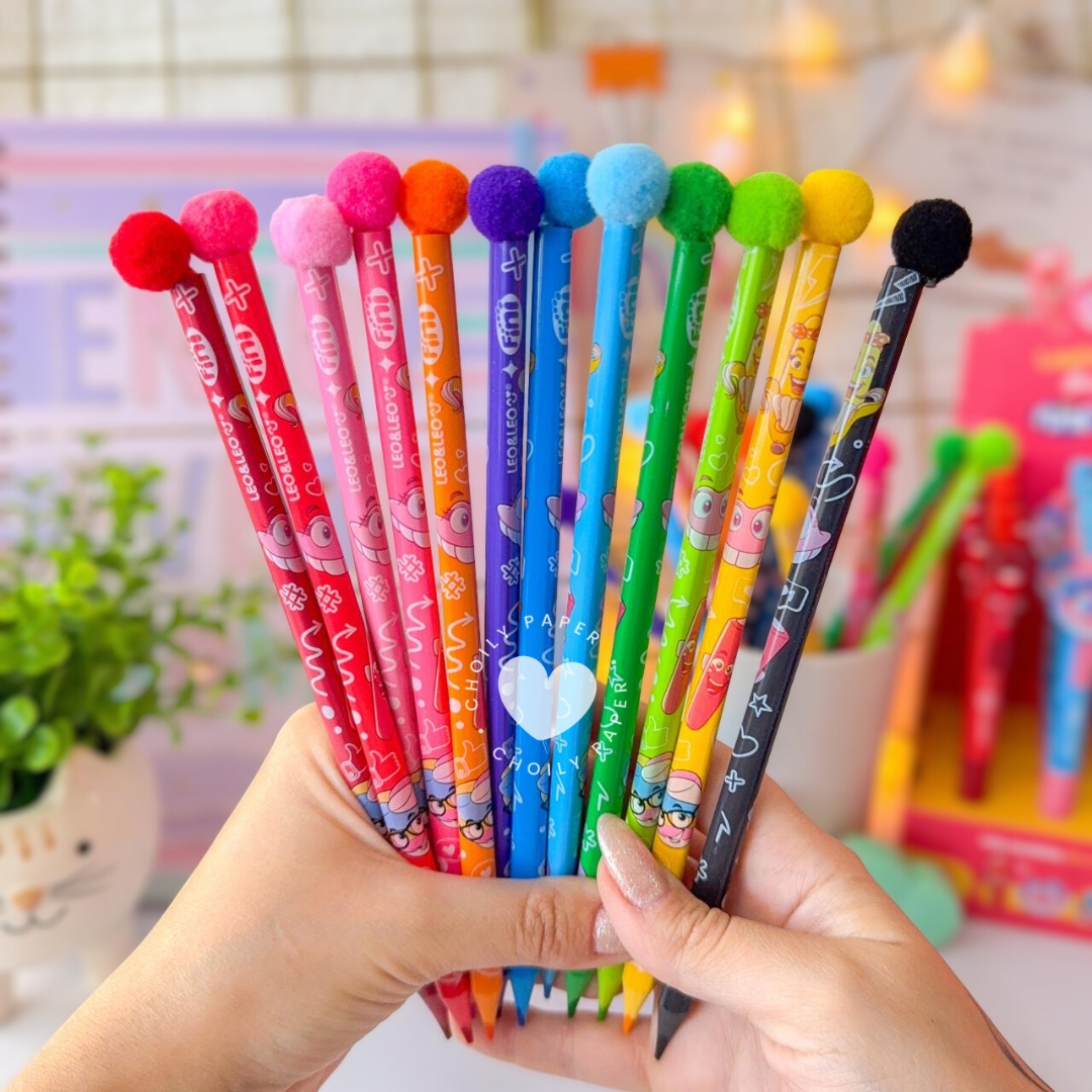 Lápis inspirado nos personagens mais doces, com formato diferenciado e com um lindo pompom na ponta. Assim é o Lápis de Cor Triangular com Pompom Fini - Pote com 12 cores Leo&Leo