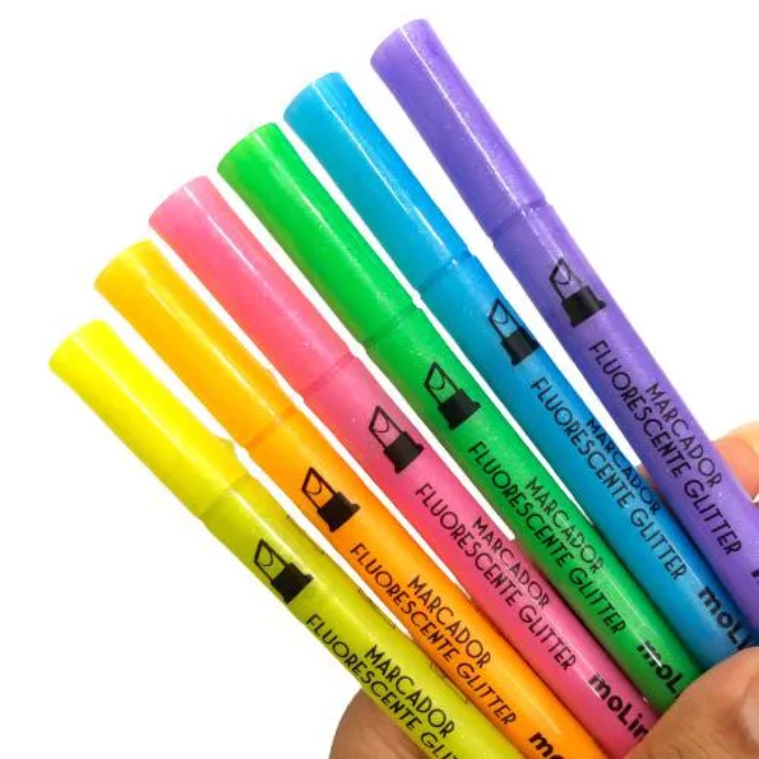 O marca texto florescente da Molin está disponível em 6 cores, é ideal para para pintar, desenhar, decorar e marcar textos com brilho;