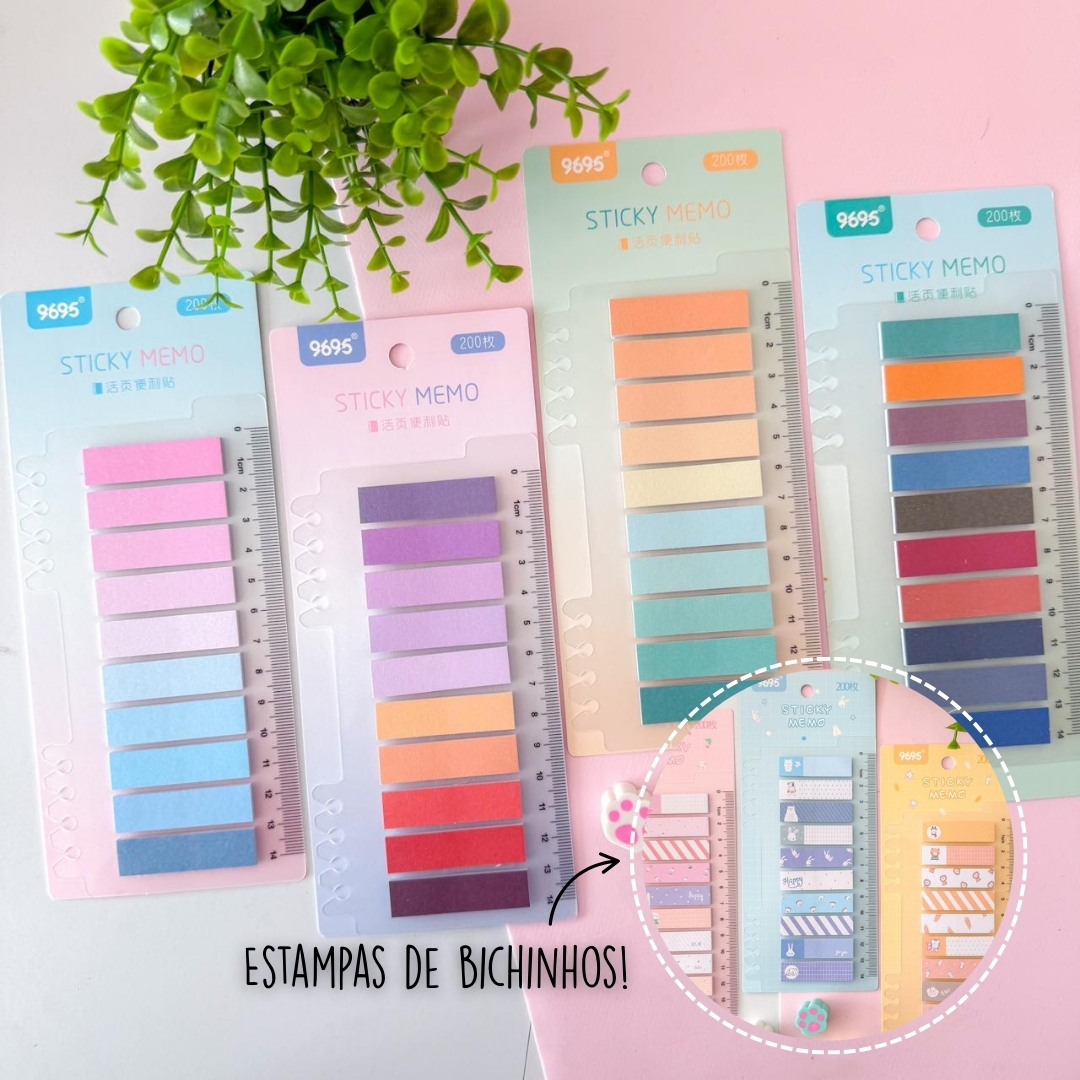 Cada cartela contém um total de 200 notas adesivas de papel divididas em 10 cores