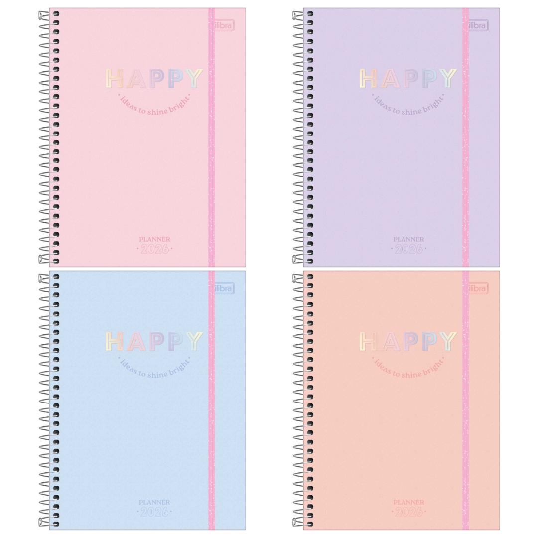 Se você busca um produto inspirado nas principais tendências de moda para se organizar, o planner espiralado Happy da Tilibra é a escolha perfeita. O produto tem tamanho 17,7 x 24 cm, capa dura com detalhes metalizados e fechamento com elástico, bolsa de papel, adesivos e folhas com visões anual, mensal e semanal.